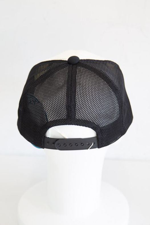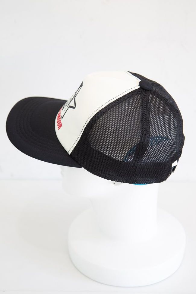 定番のトラッカー型のメッシュキャップに、人気のスターロゴとSEE NO EVILを組み合わせてプリントを施した。