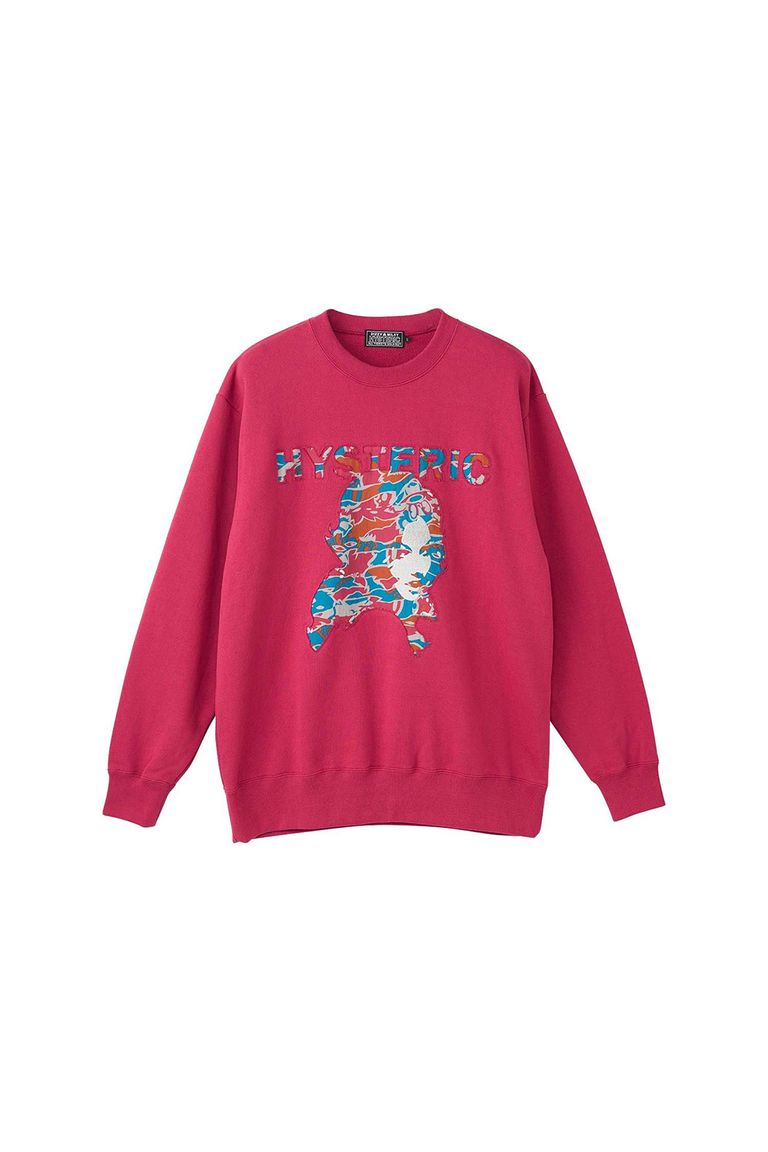 フロントには、オリジナルのカモフラージュ柄生地を裏からアップリケで重ね、表地を柄に合わせてカットアウトするという手の込んだ手法で HYSTERIC WOMAN を表現した、ミリタリー感のあるデザインのスウェット。
