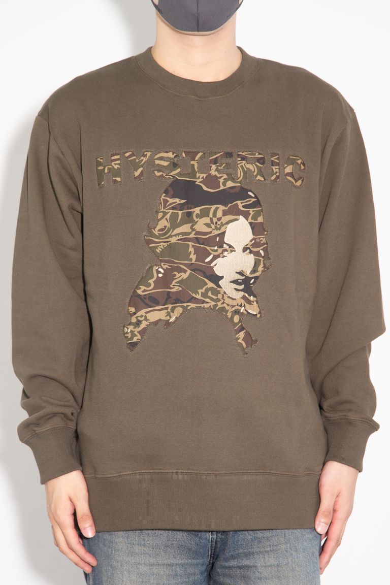 フロントには、オリジナルのカモフラージュ柄生地を裏からアップリケで重ね、表地を柄に合わせてカットアウトするという手の込んだ手法で HYSTERIC WOMAN を表現した、ミリタリー感のあるデザインのスウェット。