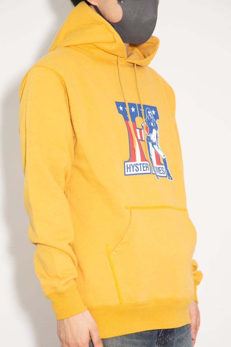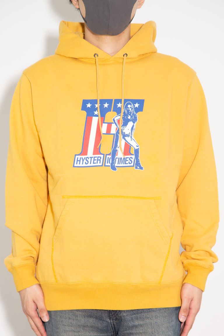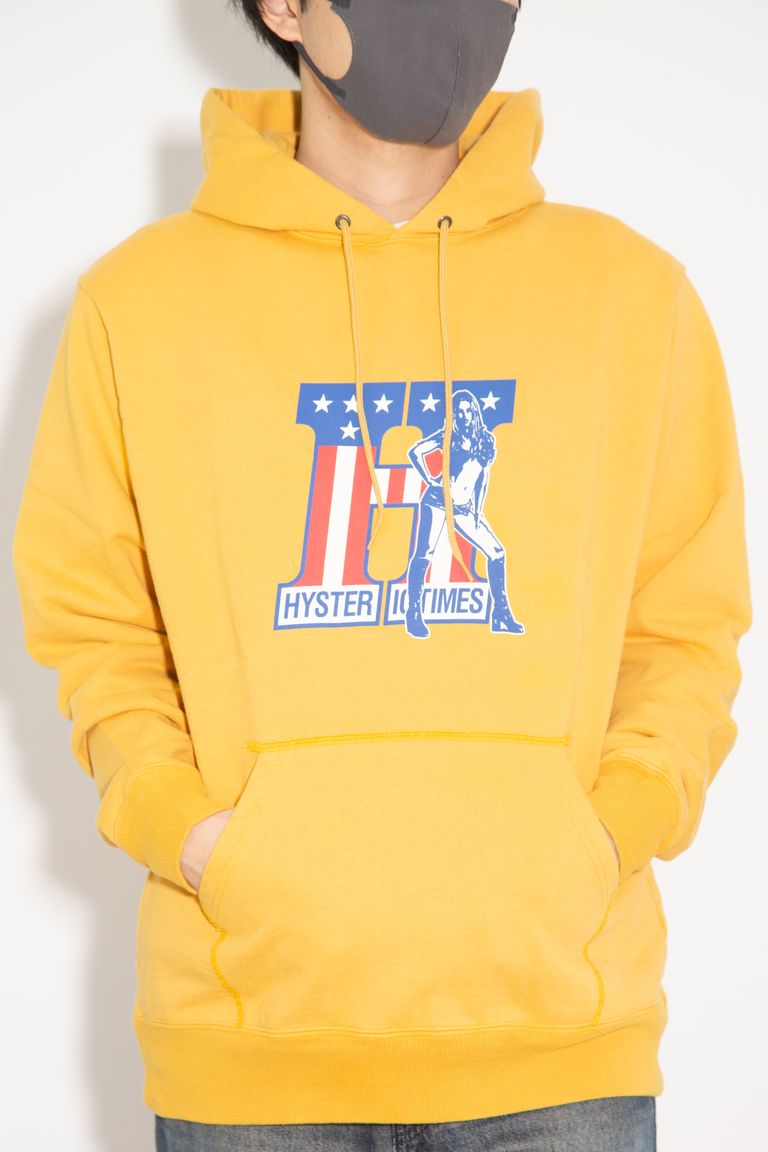フロントには、乾いたハイウェイをスロットル全開で駆け抜ける HYSTERIC WOMAN を描いたグラフィックを配したパーカー。