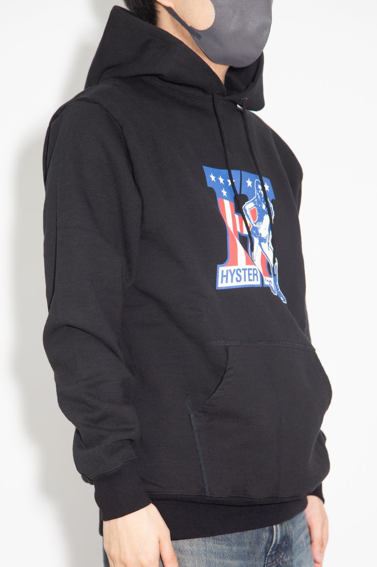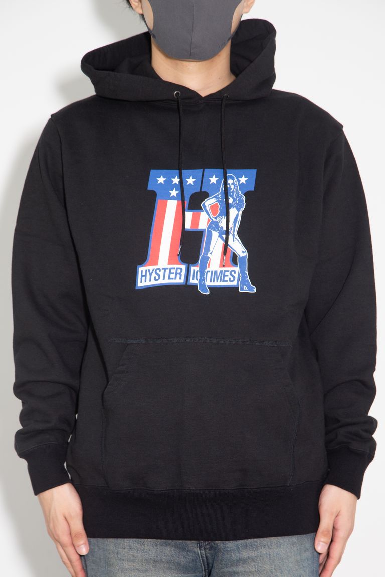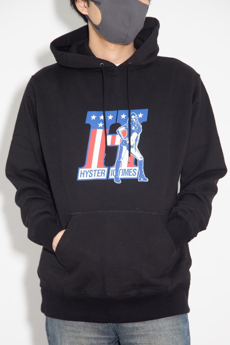 フロントには、乾いたハイウェイをスロットル全開で駆け抜ける HYSTERIC WOMAN を描いたグラフィックを配したパーカー。