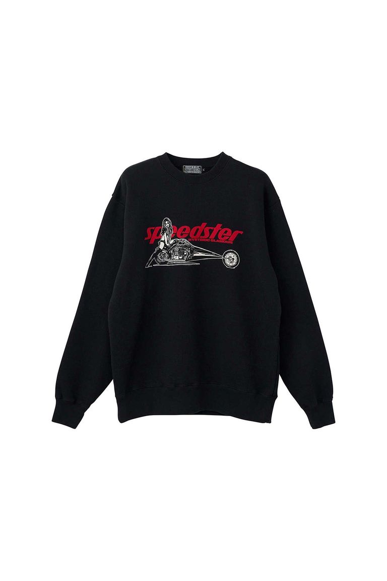モーターカルチャーが盛んな地で、ドラックレース仕様のバイクにまたがるHYSTERIC WOMANをイメージしたアイコン的なグラフィックを配したスウェット。