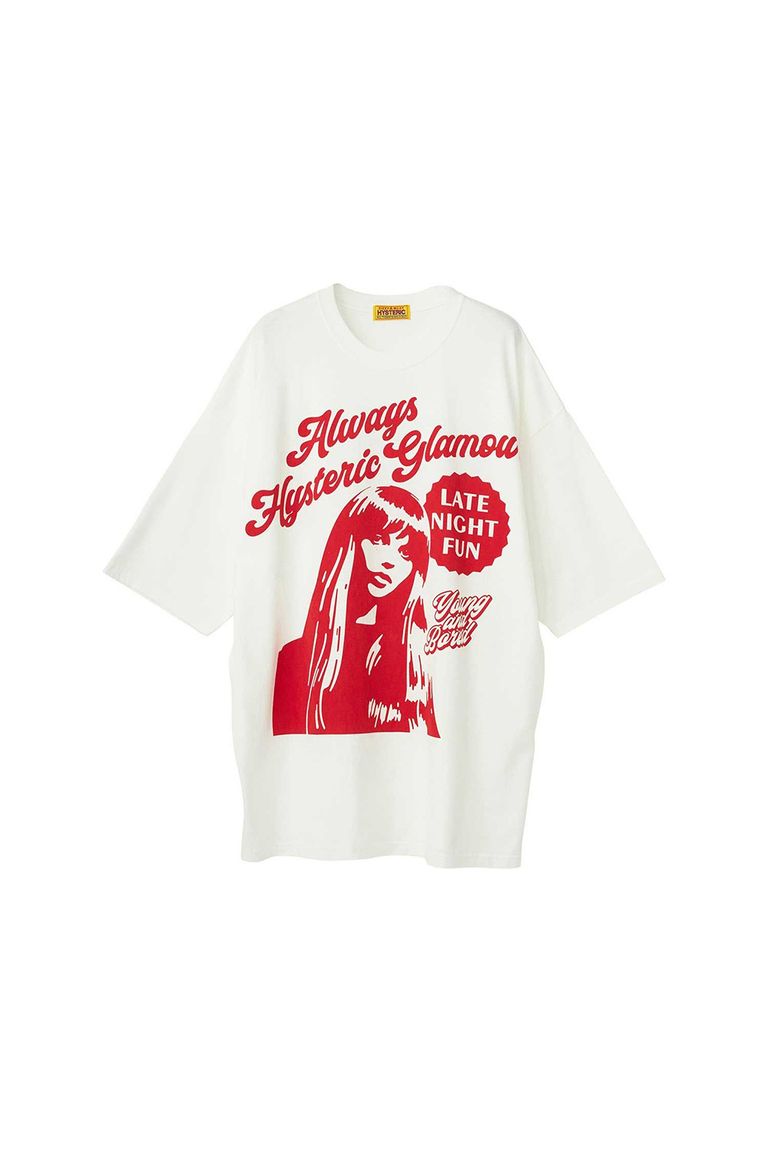 フロントに大きく配したグラフィックは、ナイトクルージングに明け暮れるHYSTEIRC WOMANのライフスタイルを雰囲気のあるロゴと掛け合わせた70年代ライクになデザイン。