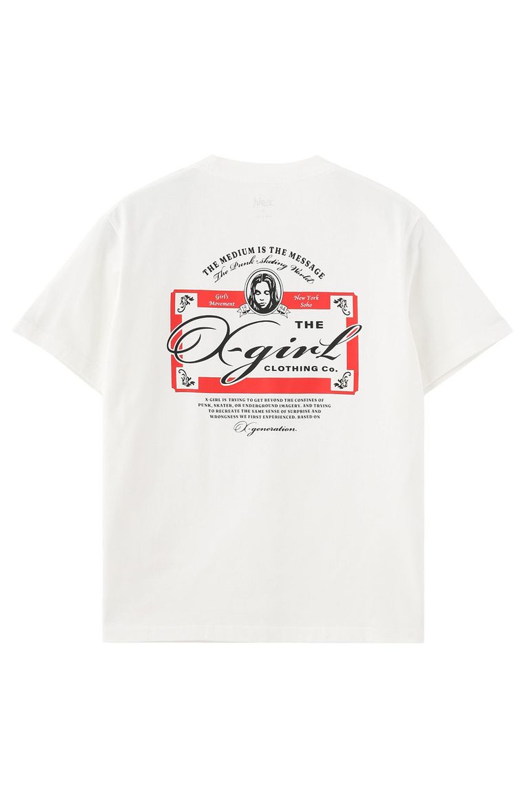 FACEロゴをラベルモチーフに落としこんだバックプリントが目を惹く半袖Tシャツ。