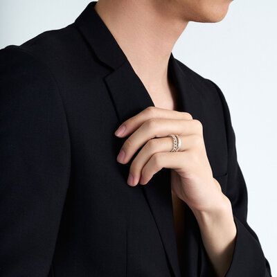 甲丸リングと喜平チェーンリングを組み合わせて、ひとつで重ね付けのように見えるデザインです。